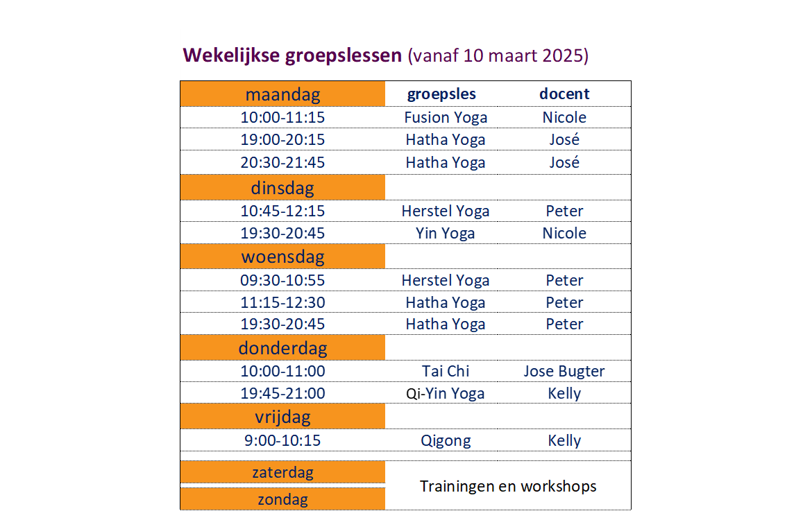 lesrooster Life-Force YogaPer jaar zijn er 40 lesweken. We volgen de basisschoolvakanties in Westervoort/Duiven en zijn dan gesloten. In de zomervakantie is er een aangepast zomerrooster. De komende vakantie periodes vind je hier. We bieden yoga groepslessen, van rustig tot meer uitdagend en voor mensen met gezondheidsklachten. Hier lees je meer over de yogastijlen.